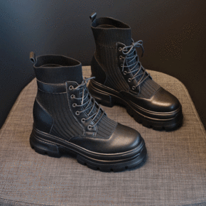 马丁靴女英伦风2021夏季新款飞织厚底瘦瘦靴网红弹...