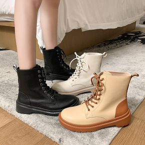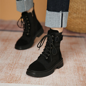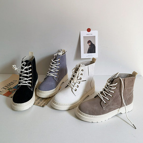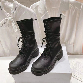 夏季爆款机车鞋靴女厚底英伦风帆布短靴子网红系带侧拉...