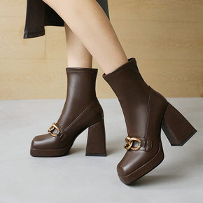 秋冬女靴时尚短靴高跟粗跟法式复古时装靴链条方头马丁...
