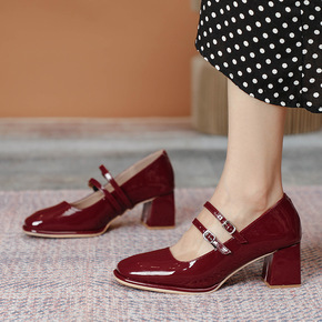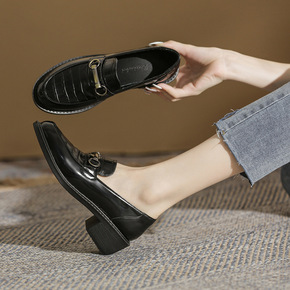 2021年春秋新款软皮方头中跟单鞋女粗跟英伦皮鞋百...
