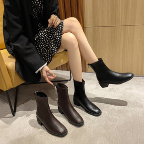 2021小香风秋冬新款短筒靴女法式复古粗跟拼接侧拉...