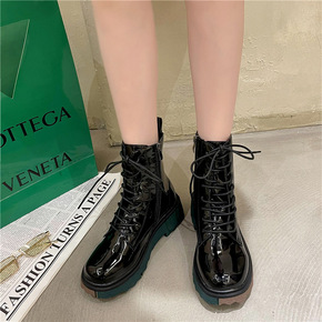 现货原创设计2021新款秋冬皮靴女漆皮超软厚底单靴...