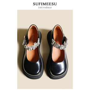 水钻圆头厚底增高玛丽珍单鞋女小皮鞋2021新款30...