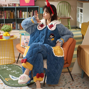 睡衣女冬季冬天珊瑚绒法兰绒夹棉袄三层加厚超厚加绒家...