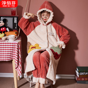 冬季加厚珊瑚绒三层夹棉翻领开衫长睡袍套装卡通可爱公...