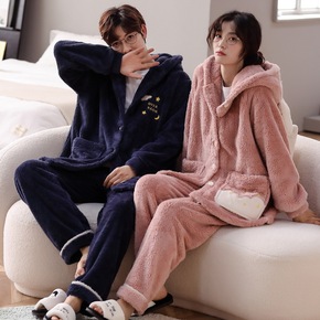 秋冬季睡衣女开衫法兰绒简约宽松休闲加绒加厚保暖珊瑚...