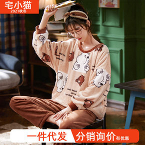 宅小猫珊瑚绒睡衣女士2021新款春秋冬季加厚冬天法...