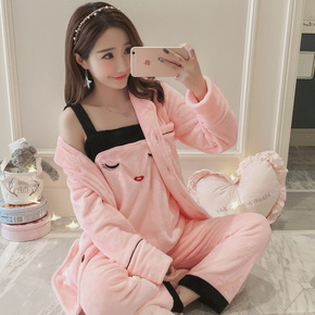 珊瑚绒睡衣女秋冬季三件套装性感吊带长袖加厚款睡袍法...