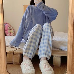 秋冬季法兰绒睡衣女学生可爱格子可外穿珊瑚绒家居服套...