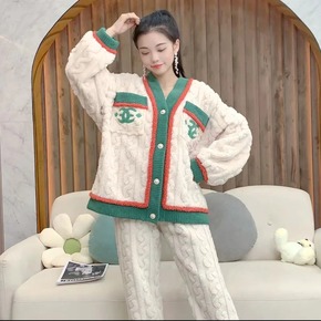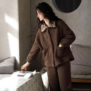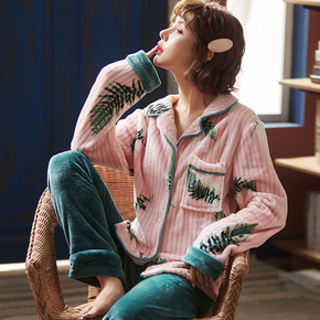 睡衣女秋冬季珊瑚绒V领开衫提花绒保暖家居服套装...