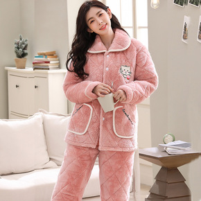 睡衣女秋冬季三层加厚法兰绒夹棉加棉保暖珊瑚绒韩版家...