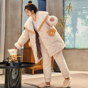 2021三层加绒超厚夹棉睡衣女秋冬季黑色大码加厚棉...