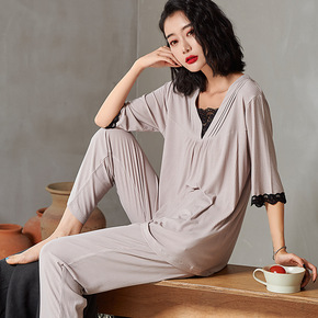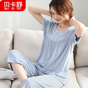 莫代尔睡衣女夏季薄款中年妈妈女士春秋季两件套装中老...