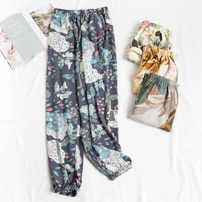 日系格子春夏秋季女士双层纱布睡裤薄款全棉宽松家居裤...