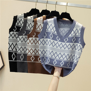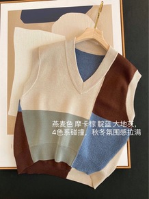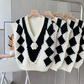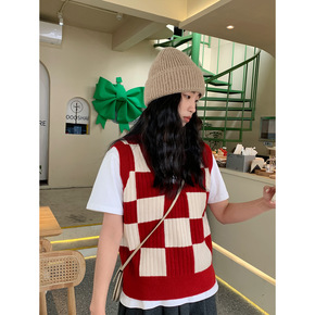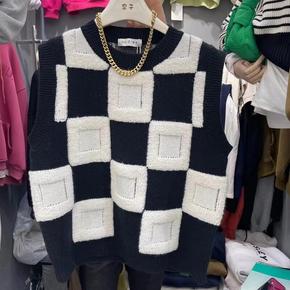 2021秋冬新款棋盘格子毛圈毛衣拼接圆领针织马甲宽...