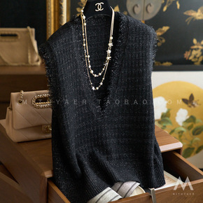 时尚法式黑色流苏边银丝闪闪无袖上衣 22秋季新V领...