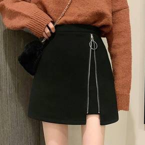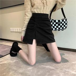 2022韩版秋冬新款毛呢开叉半身裙高腰显瘦百搭褶皱...