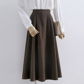 中长款a字伞裙遮胯显瘦胖妹妹大码裙子高腰咖色毛呢半...