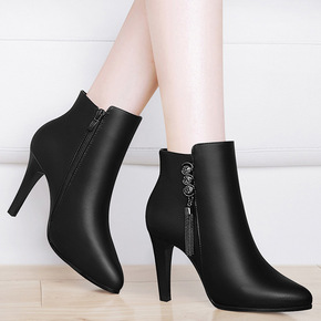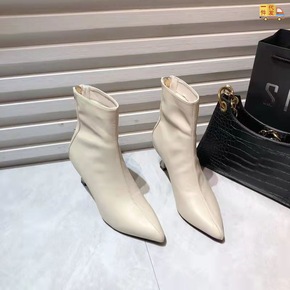 一代佳人尖头拉链短靴女白色2021年冬季新款高跟马...
