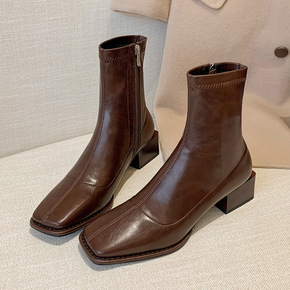 2021新款ins风方头粗跟短靴韩版瘦瘦靴拉链高跟...