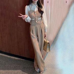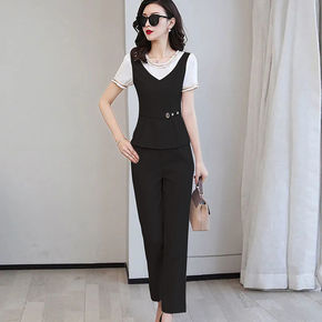 新款女神范韩版气质套装假两件拼接洋气上衣+西裤两件...
