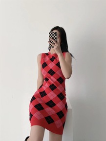 2021秋冬季新款欧美红色菱形格提花毛衣连衣裙圆领...