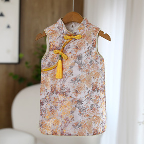 周岁礼服女宝宝一岁唐装马甲无袖旗袍裙抓周生日宴会丝...