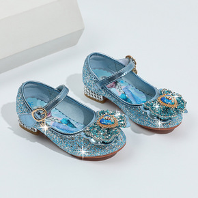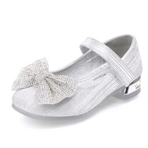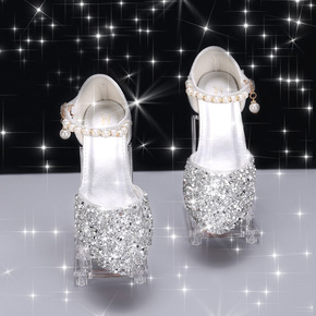 女童公主鞋新款百搭银色表演出舞蹈皮鞋主持走秀水晶鞋...