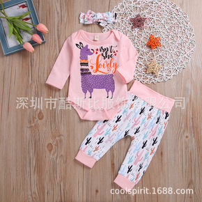 ins爆款童装欧美风羊驼印花上衣+仙人掌长裤蝴蝶结...