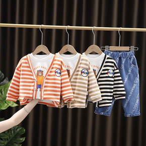 男童秋装套装2021新款宝宝条纹毛衣开衫三件套外贸...