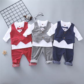 2021春秋新款男童条纹马甲三件套纯色衬衫套装潮一...