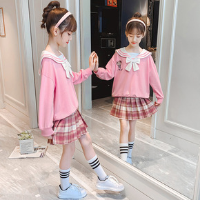 2022春童装新款女童JK套装学院风海军领卫衣格子...