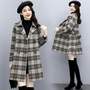 秋冬华哥弟情女式羊毛呢外套宽松大码中长款西装领格子...