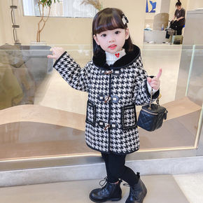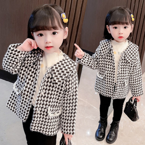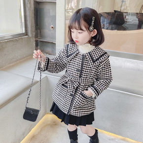 女童千鸟格大衣儿童中小童秋冬中长款时尚小香风呢大衣...