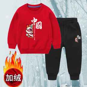 男女童加厚保暖卫衣套装 卡通中国舞狮秋冬季加绒休闲...
