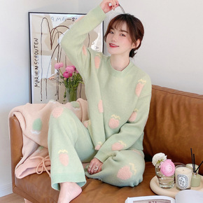 甜美气质三件套睡衣女秋冬季名媛简约针织加绒加厚家居...