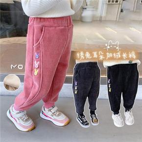 女童韩版华夫格刺绣爱心小熊加绒休闲裤儿童加厚保暖运...