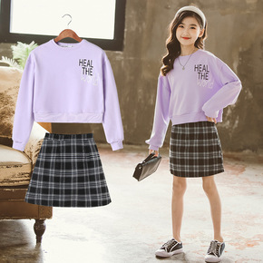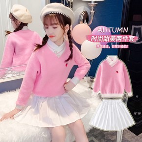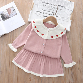 韩版女童甜美爱心娃娃领针织开衫百褶裙两件套洋气中小...