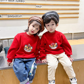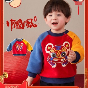 虎年2022新款加绒卫衣儿童连帽上衣男童红色加厚圆...