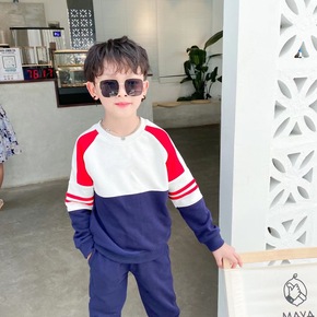 儿童撞色圆领套装 春新款童休闲卫衣卫裤两件套 批发...