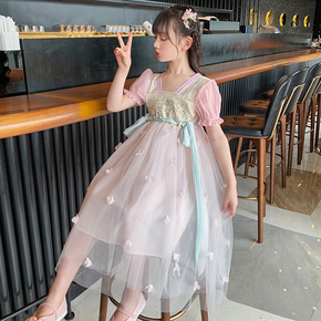 女童汉服连衣裙夏装2022年新款儿童花朵网纱公主裙...