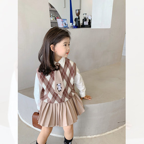 女童2022春季学院风卡通洋气高雅菱格宝宝针织马甲...