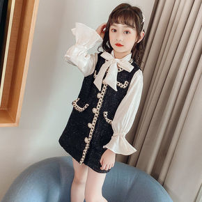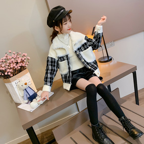 女童小香风粗花呢大衣秋季新款韩版儿童假两件洋气拼接...