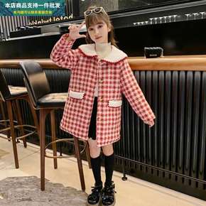 女童风衣女童千鸟格子洋气收腰加厚呢大衣2021秋冬...