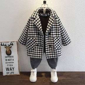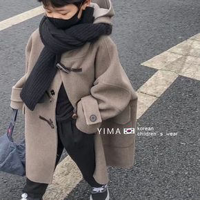 韩版童装女童冬季中长款加厚毛呢外套男童保暖牛角扣双...