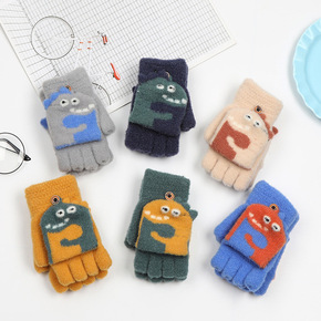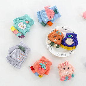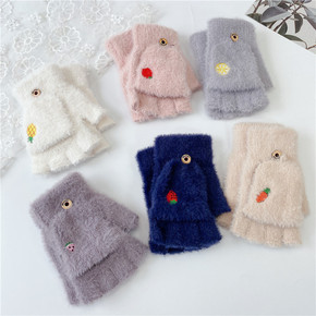 韩版冬季手套女学生可爱加绒加厚翻盖半指写字儿童毛茸...
