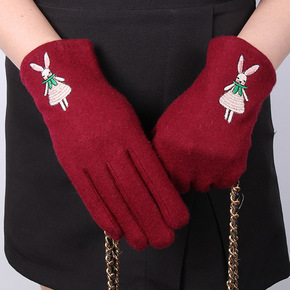 冬季红色刺绣触屏羊毛手套加绒加厚女生分指手套学生骑...