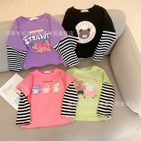 2022年春季新款童装 男女童条纹拼接袖卡通印花T...