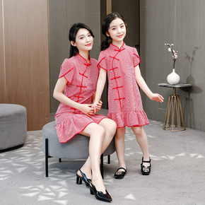 中大女童复古清新可爱格子连衣裙妈妈母女装改良旗袍大...