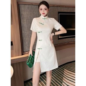 中国风复古名媛改良少女旗袍裙年暗纹提花盘扣开叉连衣...
